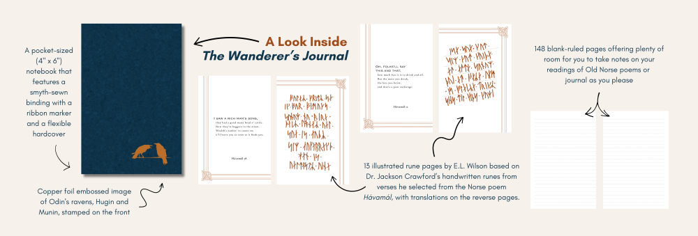 The Wanderer's Journal, a pocket-sized (4" x 6") notebook, features a smyth-sewn binding with a ribbon marker and a flexible hardcover with a copper foil embossed image of Odin's ravens, Hugin and Munin, stamped on the front. In addition to 148 blank ruled pages, the journal includes 13 illustrated rune pages with rune translations on the reverse pages. The rune illustrations by E.L. Wilson are based on Dr. Jackson Crawford’s handwritten runes from 13 verses he selected from the Norse poem Hávamál. The translations are sourced from Dr. Crawford’s frank and down-to-earth translations from "The Cowboy Hávamál," included in his 2019 Hackett Publishing book, The Wanderer’s Hávamál. The Old Norse was written with the sixteen-letter Younger Futhark runic alphabet, which is used in this journal.